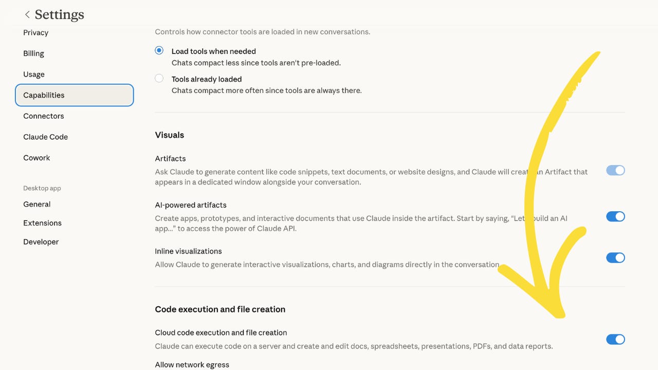 When you first open Cowork, a setting in Capabilities called Code execution and file creation is turned off by default. Without it, Claude Cowork can’t do its job. It can read your files. It can think about your files. But it cannot create or change anything.