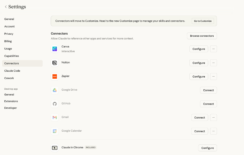Connectors link Claude to services you already use, and that makes your life much easier. Notion, Gmail, Google Calendar, Canva, Slack, Zapier. Instead of downloading a file, uploading it to Claude, and putting the output back manually, Claude talks to the service directly.