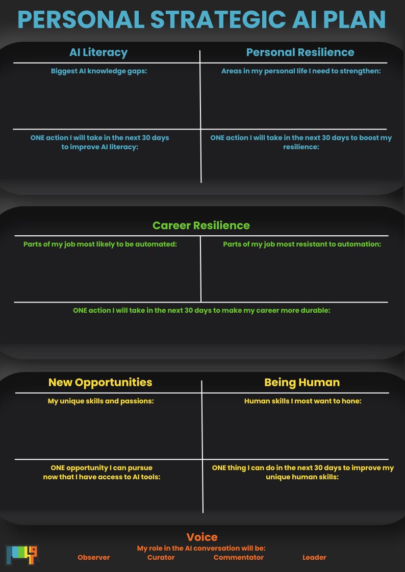 The sooner you invite AI into your life on your terms, the less chance it has to barge in unannounced. But if you’re feeling stuck (or if your plan consists of ‘use ChatGPT’), I’ve built you an interactive one-page Personal AI Planner - everything you need to get you started with designing AI into your life. This planner is based on my personal approach to learning AI and has enabled me to stay focused, carve out time for studying and trialling tools, and make a huge amount of progress on my mission to become a SuperHuman.